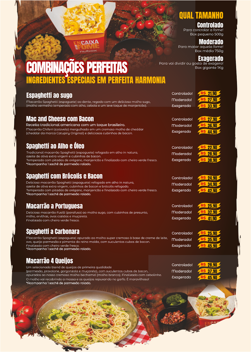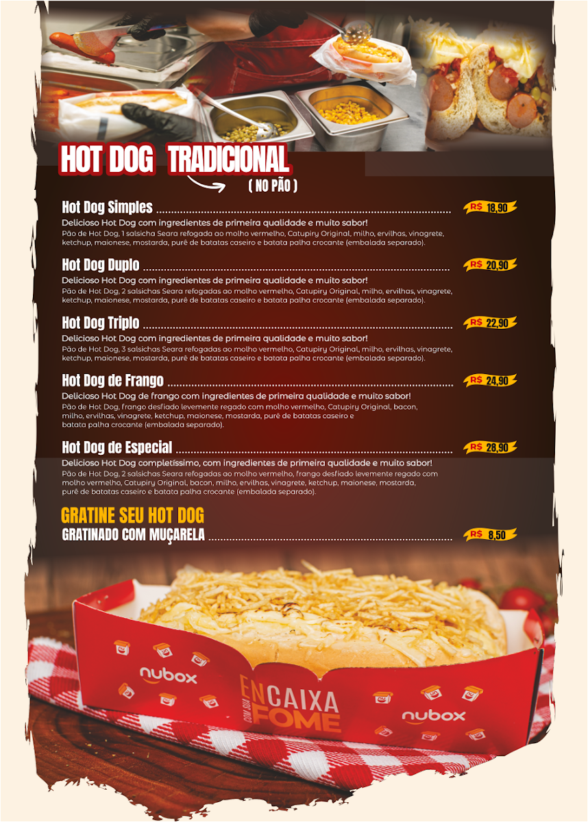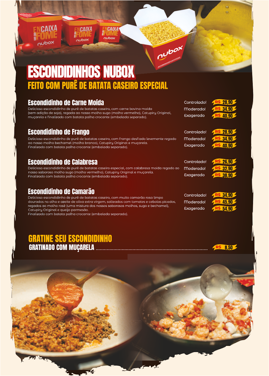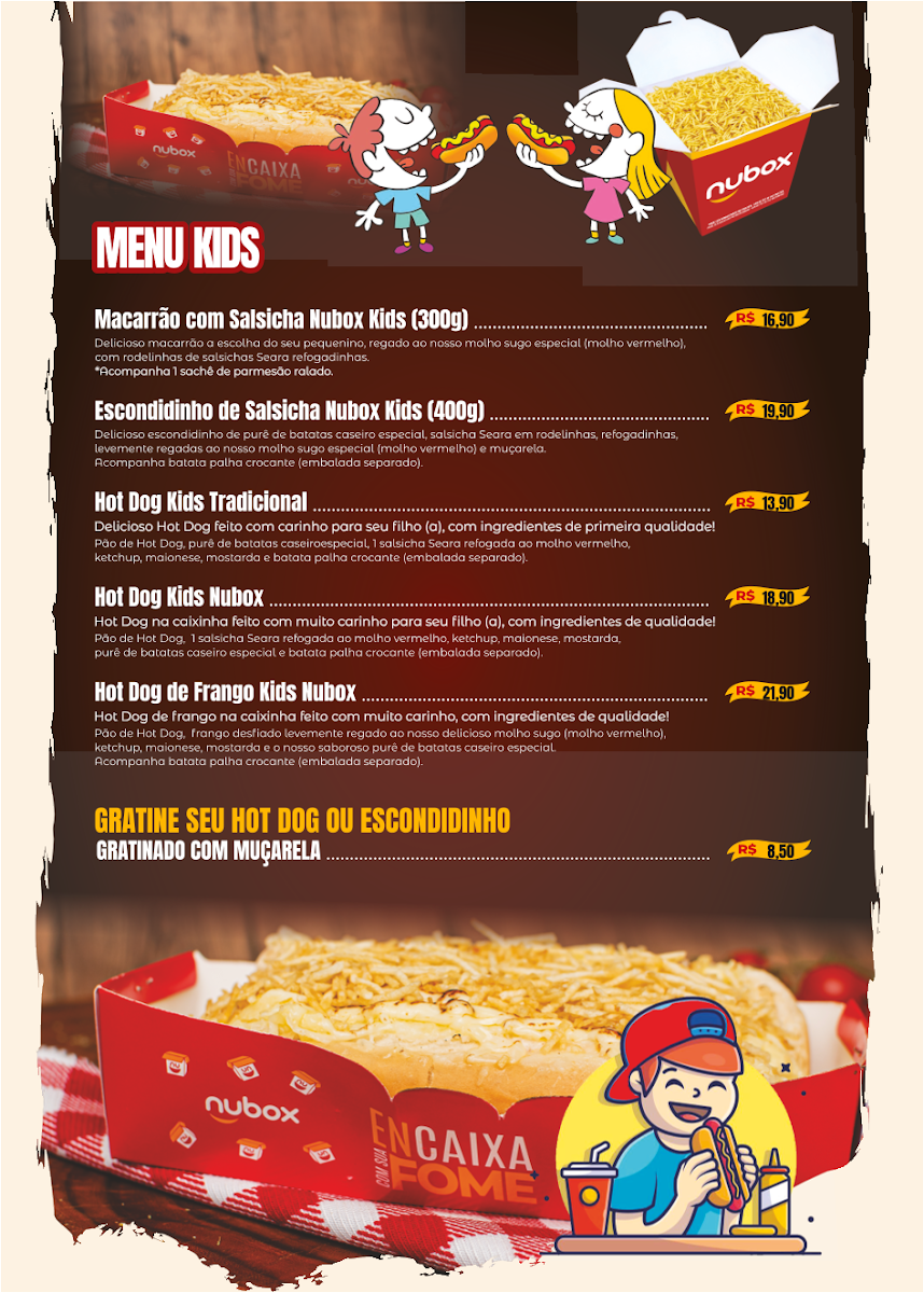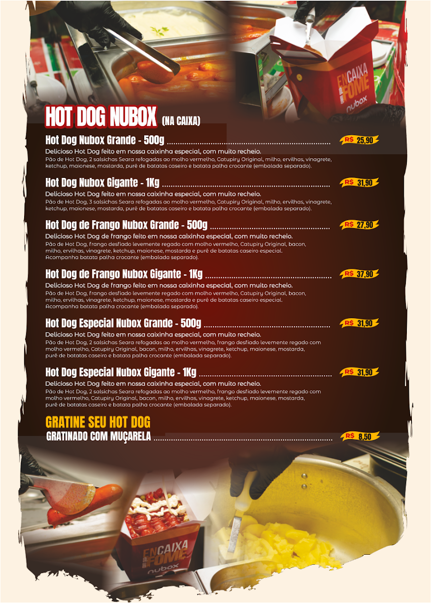 Nubox is a fast food gem located in Mogi Guaçu, Brazil, specializing in hot dogs and classic American comfort dishes. Their menu boasts well-crafted favorites like the Mac and Cheese with Bacon, featuring tender cavatappi pasta bathed in rich Catupiry cheddar sauce with crispy bacon bits, delivering a creamy, savory bite. For pasta lovers, the Espaguete ao Sugo offers perfectly al dente spaghetti drenched in a vibrant, tomato-rich red sauce, complemented by a parmesan sachet that enhances each mouthful. The traditional Espaguete ao Alho e Óleo brings simplicity with flavorful seasoning, a timeless classic done right.